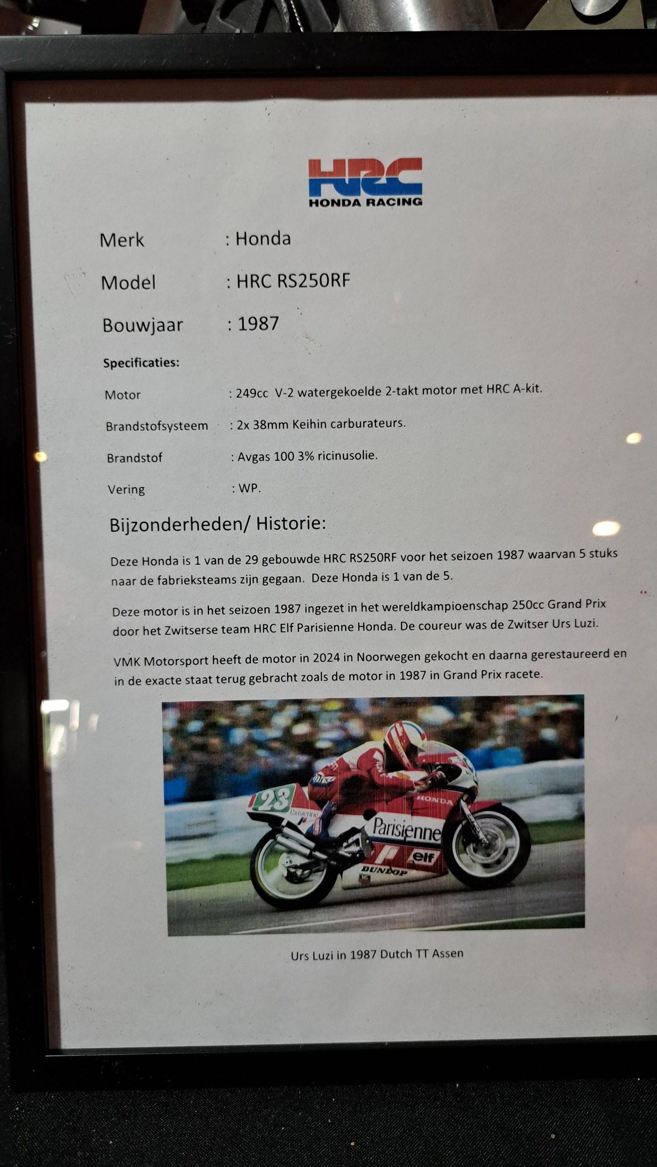 Veenstra is samen met zijn broer sinds twee jaar in het bezit van een originele Honda RS250 Grand Prix motor uit 1987. De motor is een semi-fabrieksracer van het ELF-Parisienne Team, die werd bestuurd door de Zwitser Urs Luzi. “Een motor uit deze periode stond hoog op mijn verlanglijst,” laat Veenstra weten. “Toen ik jong was kon ik dat natuurlijk niet betalen, maar nu ik wat ouder ben was die mogelijkheid er wel. Zo heb ik via mijn connecties deze motor kunnen aanschaffen.”